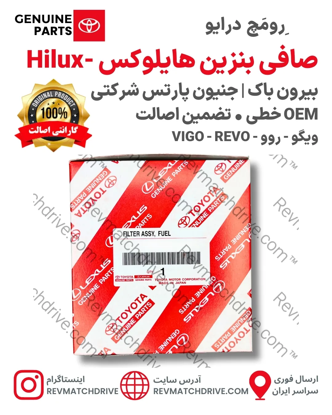 🔧 صافی بنزین تویوتا هایلوکس (Toyota Hilux Fuel Filter) قطعه‌ای حیاتی برای تصفیه سوخت و حفاظت از موتور (هایلوکس) در مدل‌های ((ریوو) Revo, ویگو (Vigo)) است. این فیلتر سوخت با پارت‌نامبر (( استعلام موجودی انبار )) از برند (جنیون پارتس)، ساخت (ژاپن)، مناسب برای نسل‌های هفتم و هشتم، موتورهای بنزینی و دیزلی 4 و 6 سیلندر (2000 و 2700 سی‌سی) و تیپ‌های تک کابین، دو کابین، ویگو، تایگر، SR5 و GR است. با (تمامی محصولات دارای گارانتی اصالت کالا و سلامت فیزیکی می‌باشند و در صورت وجود مشکل، پشتیبانی فنی و خدمات پس از فروش واقعی در دسترس شماست. 🛠️📞)، خیالتان از کیفیت و اصالت راحت باشد! 🌟